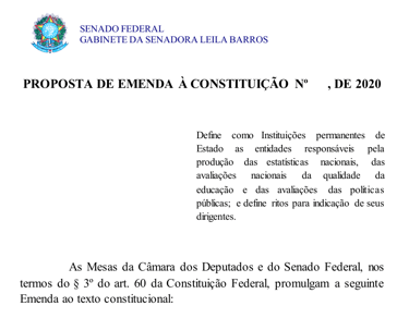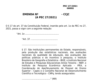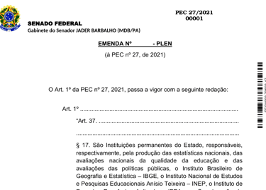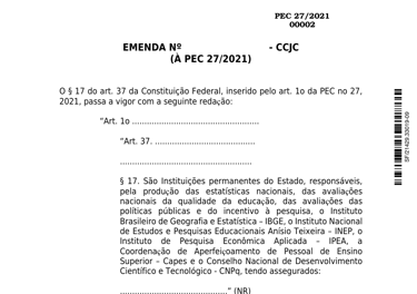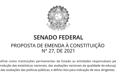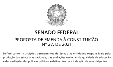 Se aprovada, a Proposta de Emenda Constitucional (PEC) 27/2021 transforma as instituições responsáveis pela produção de estatísticas nacionais, pela avaliação da qualidade da educação e pela avaliação de políticas públicas em entidades permanentes do Estado. O objetivo é garantir a autonomia técnica, funcional, administrativa e financeira, de modo a resguardar as atividades típicas exercidas por essas instituições contra pressões políticas conjunturais ou iniciativas de gestão que possam levar à precarização, à perda de qualidade ou à imposição de condicionantes monetários para que cidadãos, pessoas físicas ou jurídicas, tenham acesso aos serviços prestados por essas autarquias públicas.
